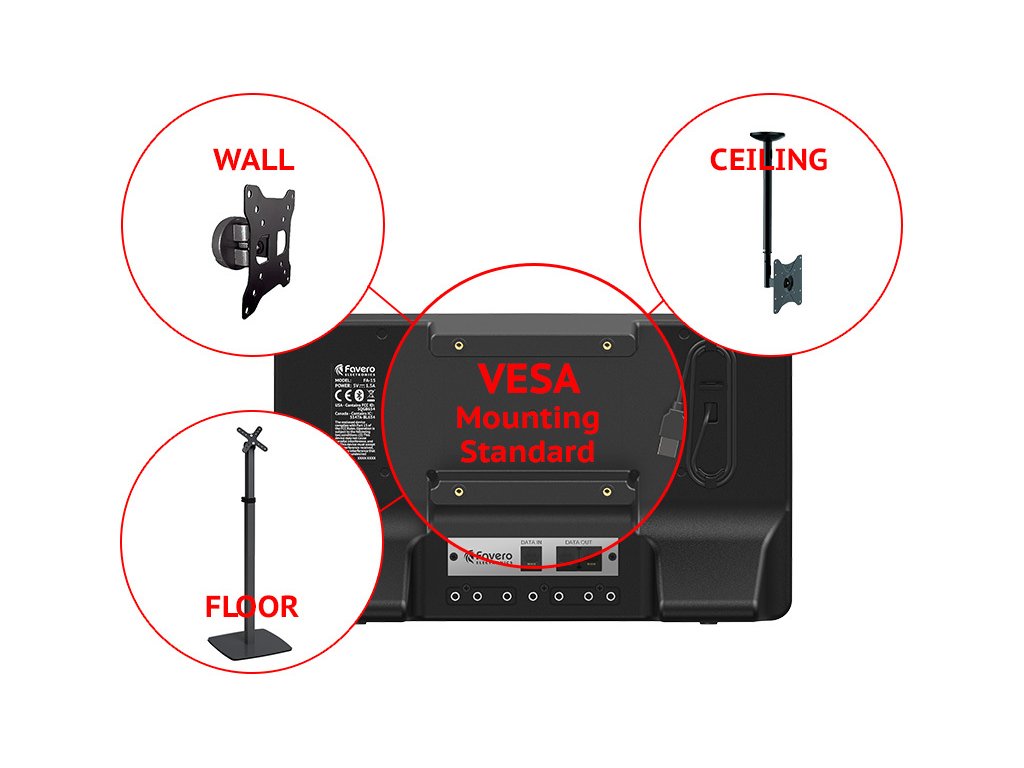- VESA standard for attaching the device to VESA wall or ceiling mounts and floor stands readily available on the market.